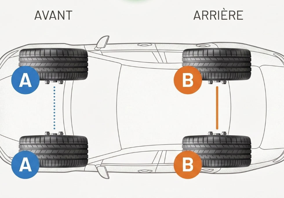 La réglementation ne vous impose pas d’avoir quatre pneus identiques. En revanche, elle impose une règle claire : un même essieu doit toujours recevoir des pneus cohérents.