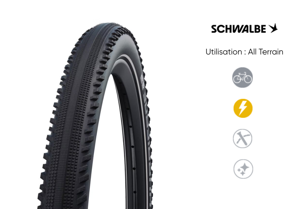 Le semi-slick comme le SCHWALBE Hurricane HS499 possède un centre presque lisse. Il roule vite, limite l’usure sur bitume et reste suffisamment sécurisant en chemin sec grâce à ses crampons latéraux. Si vos sorties comportent majoritairement de l’asphalte avec quelques passages sur pistes, c’est une solution très efficace.