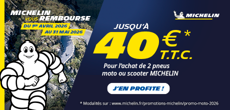 Jusqu'au 31.05 | Jusqu'à 40€ remboursés sur une sélection de pneus moto Michelin. L'excellence française en pneus moto. Inscrivez-vous en ligne après achat pour obtenir votre remboursement. ➞ Voir les conditions.
