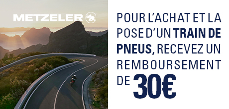 Jusqu'au 30.09 | Jusqu'à 30€ remboursés pour l'achat de pneus moto Metzeler. Précision et grip moto toutes conditions. Inscrivez-vous en ligne pour votre remboursement. ➞ Voir les conditions.